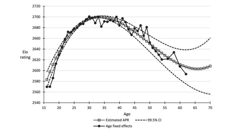 Los resultados empíricos son consistentes con el modelo teórico y con otras evidencias empíricas sobre el efecto de la edad en el ajedrez o en otras tareas cognitivas. Se estima que el rendimiento alcanza su máximo, en promedio, a los 33 años de edad, y que disminuye después debido a factores relacionados con el envejecimiento del cerebro, la fatiga y la motivación. La relación entre la edad y el rendimiento es más precisa usando las puntuaciones Elo que usando los resultados de las partidas.